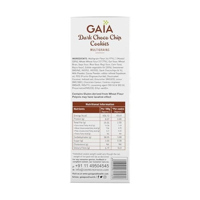Gaia Dark Choco Chip Cookies –(200g Each) | High-Fiber, Crunchy Cookies with Real Dark Chocolate Chips | No Trans Fat | Perfect Tea-Time Snack | Guilt-Free Indulgence | Vegetarian & Tasty