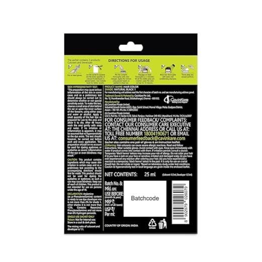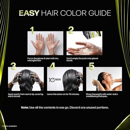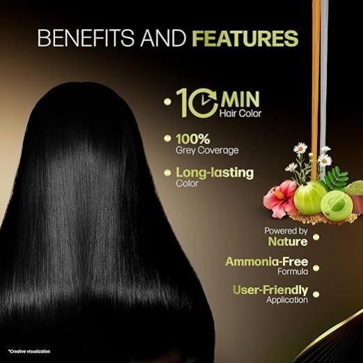An enriching hair colouring experience with Amla, Henna, Bhringraj, Hibiscus and Fenugreek Benefits of Ingredients gives superfood to hair, conditions and strengths hair roots, masks grey hair and maintains hair health Super Easy One Time Use Shampoo Based Hair Color Sachet with a Pair of Reusable Transparent Gloves