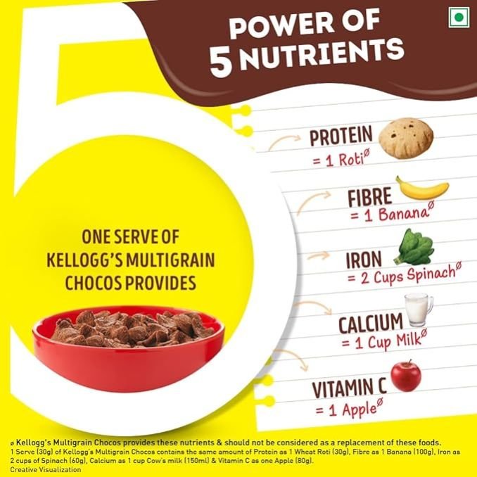Power of 5 nutrients – The NEW Multigrain Chocos is a powerhouse of nutrients. 1 serve of Chocos (30g) contains the same amount of protein as 1 wheat roti (30g), fibre as 1 banana (100 g), iron as 2 cups of spinach (60 g), calcium as 1 cup cow’s milk (150 ml) & vitamin C as one apple (80g).