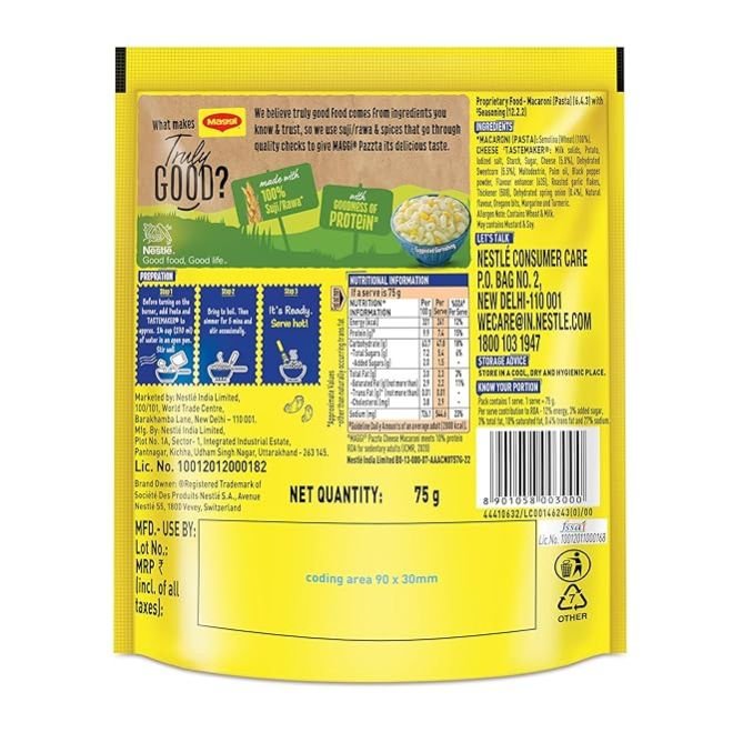 MACARONI (PASTA): Semolina (Wheat) (100%). CHEESE TASTEMAKER®: Milk solids, Potato, lodized salt, Starch, Sugar, Cheese (5.8%), Dehydrated Sweetcorn (5.5%), Maltodextrin, Palm oil, Black pepper powder, Flavour enhancer (635), Roasted garlic flakes, Thickener (508), Dehydrated spring onion (0.4%), Natural flavour, Oregano bits, Margarine and Turmeric.Allergen Note: Contains Wheat & Milk. May contain Mustard & Soy.