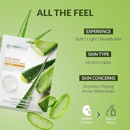 MIRABELLE Aloe Vera Facial Serum Sheet Mask | Hydrates & Calms Redness | (Pack Of 1), 25Ml