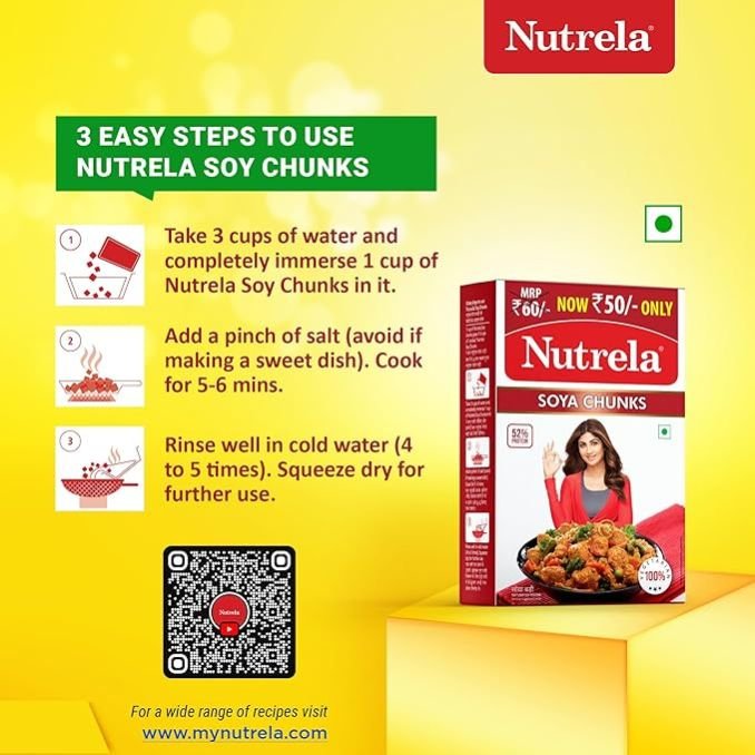 SOYA CHUNKS: Nutrela Soya chunks are made using soy flour that has been 'defatted'. It has the same protein content as meat, and also similar chewy in texture. The texture quickly changes to soft and spongy as soon as submerged in warm water or added to gravy.