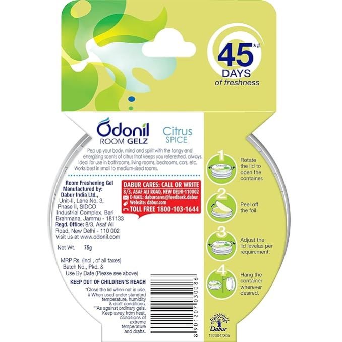 Odonil Room Freshening Gel offers a fine selection of nature-inspired scents to keep your room fresh and fragrant. It Comes with fragrance control mechanism to calibrate the amount of fragrance It keeps your bedroom and living room fragrant for a long time. Lifespan: Lasts upto 45 days