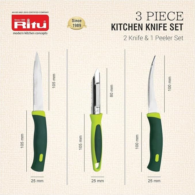 RITU Stainless Steel Kitchen Knife and Peeler Set of 3 Combo | for Daily Use | Sharp Blades Multipurpose Peeling Cutting Tool | Rust -Resistant Durable Blades | Green Ergonomic Handle