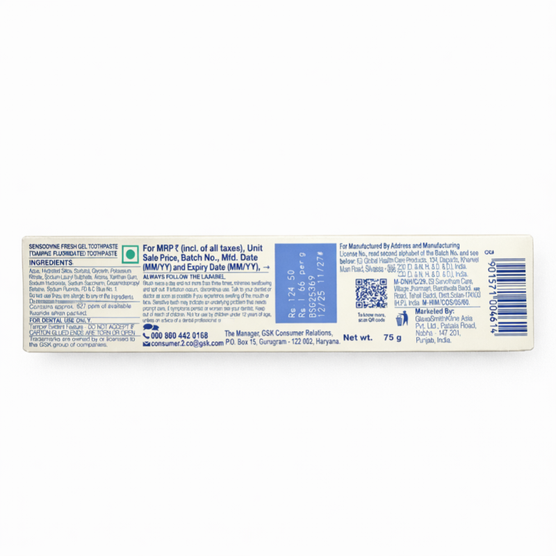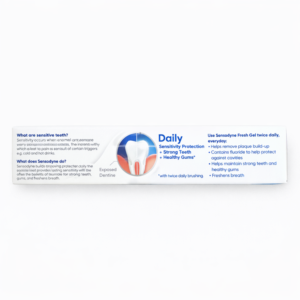 Sensodyne toothpaste is a dentist recommended toothpaste brand for sensitive teeth. For nearly 60 years, Sensodyne has created unique formulations to help people overcome tooth sensitivity while still providing the benefits of fluoride, cavity protection, fresh breath and whitening to maintain healthy teeth. Sensodyne Sensitive Fresh Gel Toothpaste is specially formulated to relieve tooth sensitivity. When enamel is worn away or gums recede, the dentine underneath becomes exposed. This can cause short sharp sensations when eating or drinking something cold, hot, sweet or sour. Sensodyne Fresh Gel toothpaste provides clinically proven sensitivity relief and all the benefits for a regular toothpaste. It has a cool refreshing taste that leaves your mouth feeling fresh and clean. Sensodyne Fresh Gel toothpaste also contains fluoride that strengthens teeth and prevents decay. So what are you waiting for? Buy the product online at the best rate, right here!