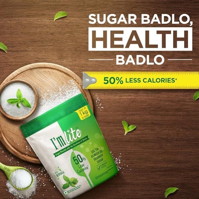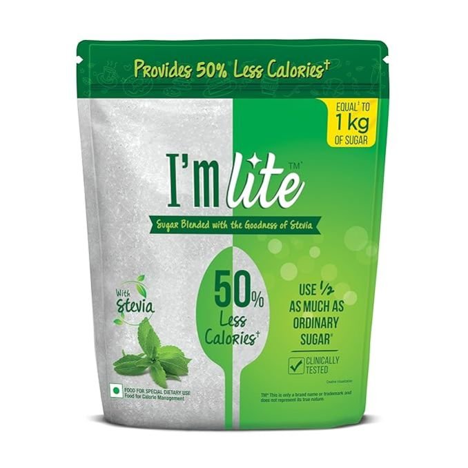 I'M Lite is a blend of Sugar & 100% Natural Stevia. Provides 100% Sweetness of Sugar, with 50% Less Calories. It’s an ideal replacement for Sugar across all food items like Hot & Cold beverage, Sweet Preparations, Cooking & Baking Needs. 500g Pack of I'M Lite is equal to 1 Kg of Sugar in Sweetness. In Equivalence, ½ Spoon of I'M Lite provides the Sweetness of 1 Spoon of normal Sugar.