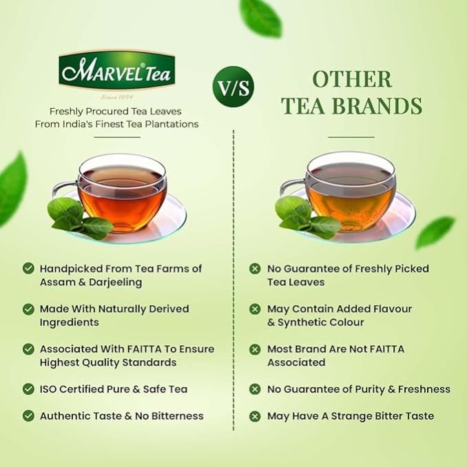 Premium Quality: Our tea is sourced from the finest tea estates in Assam & Darjeeling, ensuring top-notch quality with every sip. Rich Flavor: Indulge in the robust and flavorful taste of our tea, carefully crafted to satisfy your palate. Refreshing Aroma: Enjoy the delightful aroma that fills the air as you brew a cup of our Marvel Red Tea and be energized for the whole day Ethically Sourced: We prioritize ethical sourcing practices, supporting fair trade and sustainable farming methods to bring you the best tea experience while caring for the environment and communities. Perfect Gift: Share the joy of tea with your loved ones by gifting them our exquisite tea collection, ideal for any occasion.