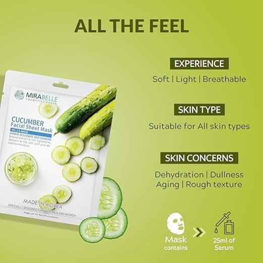 MIRABELLE Cucumber Facial Serum Sheet Mask | Soothes & Refreshes & Hydrates | (Pack of 1) 25ml